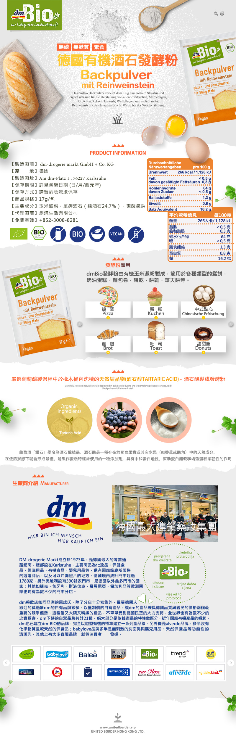 Reinweinstein entsteht auf natürliche Weise bei der Weinherstellung. Das dmBio Backpulver verleiht dem Teig eine lockere Struktur und eignet sich sich für die Herstellung von allen Rührkuchen, Mürbeteigen, Brötchen, Keksen, Biskuits, Waffelteigen und vielem mehr. So gut schmeckt es mit dmBio.
